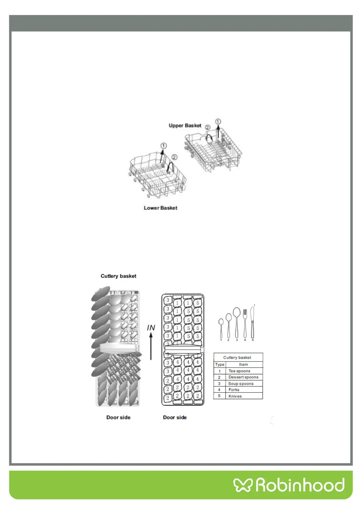 Arrange the cutlery in the tray as shown. Cutlery should be placed to ensure that water