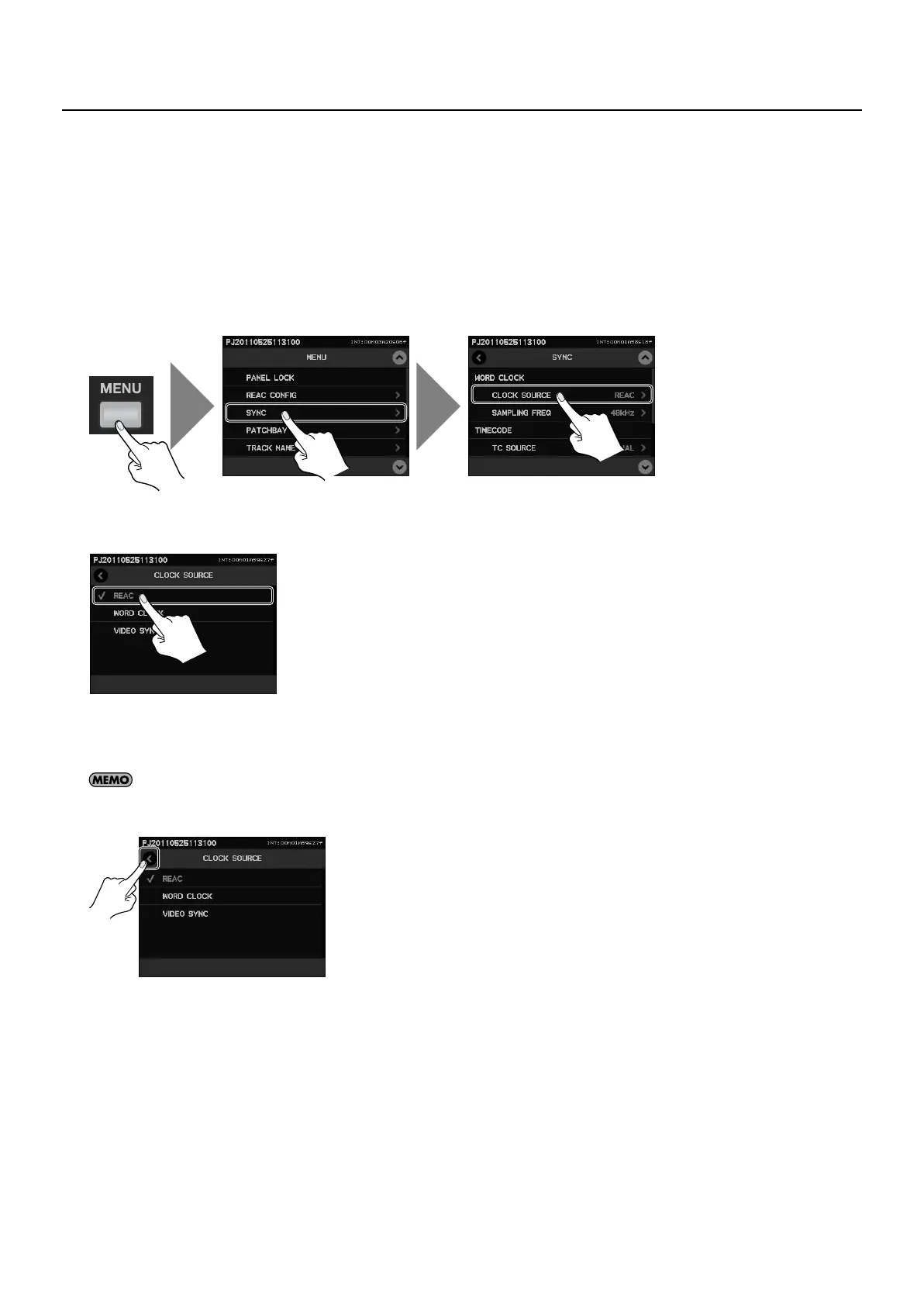 Press the [MENU] button to display the menu screen, then select [SYNC]. Then select [CLOCK SOURCE].