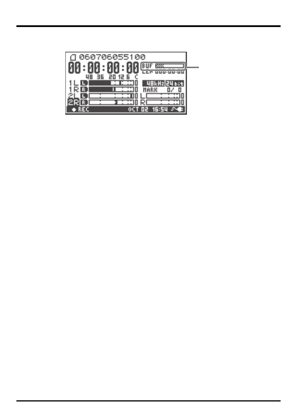 From the Main screen, press the [DISP] button twice to show the recording buffer capacity (BUF: buffer