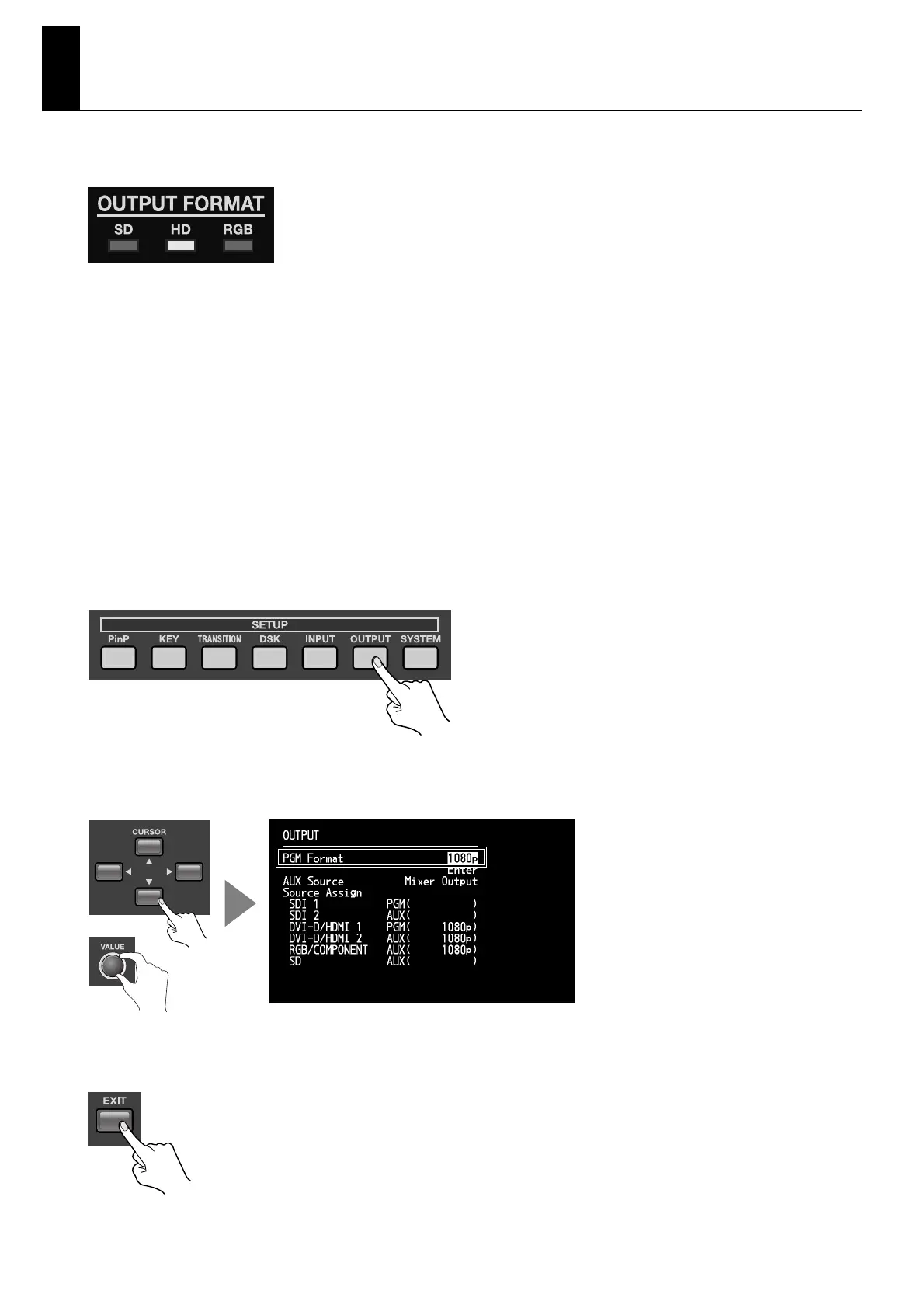 Select the output format to match the source and output equipment connected to the V-1600HD. Making a selection makes one