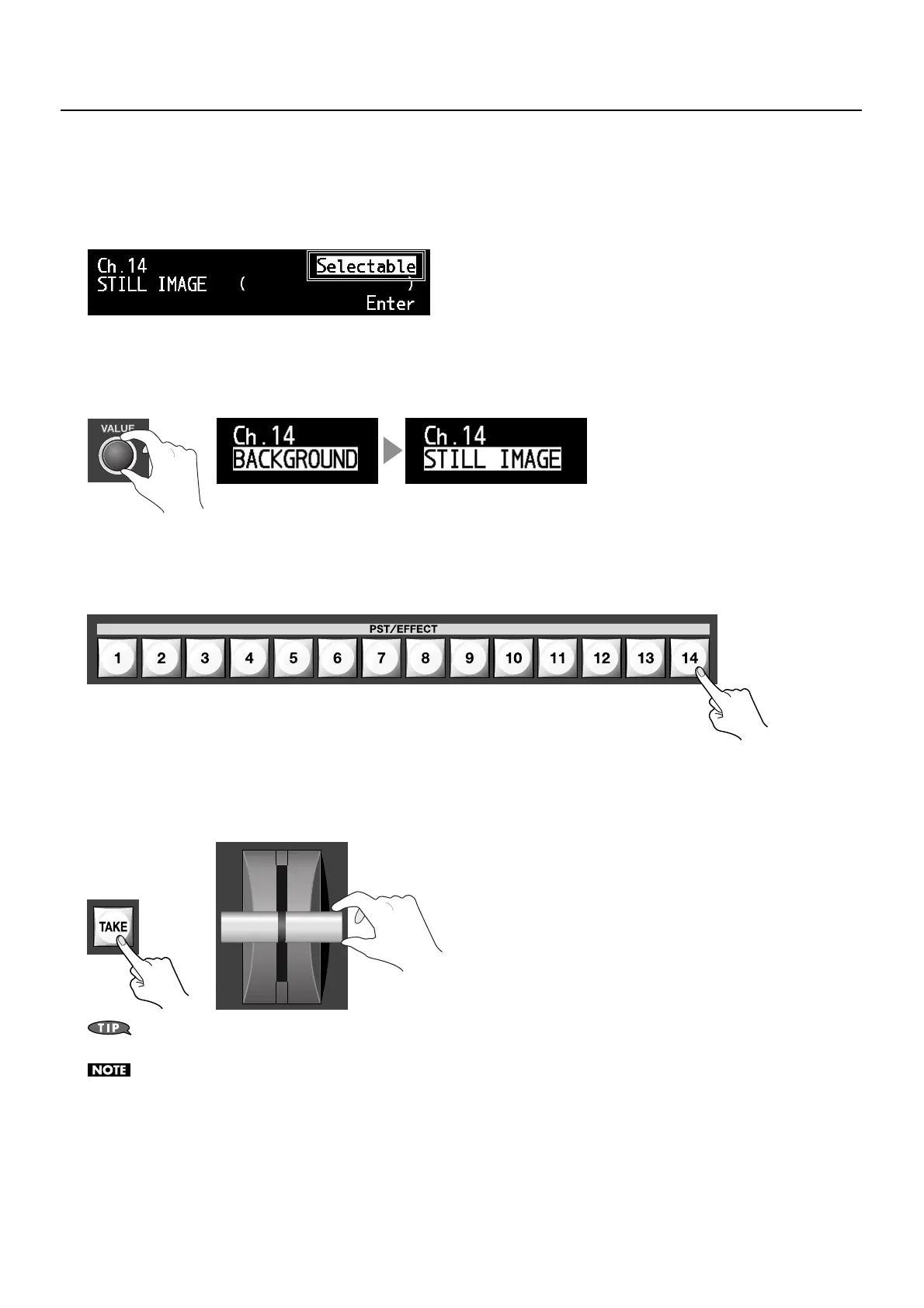 Go to the PST/EFFECT section and press the button for channel 14 to place the still image on standby. If the display mode for the