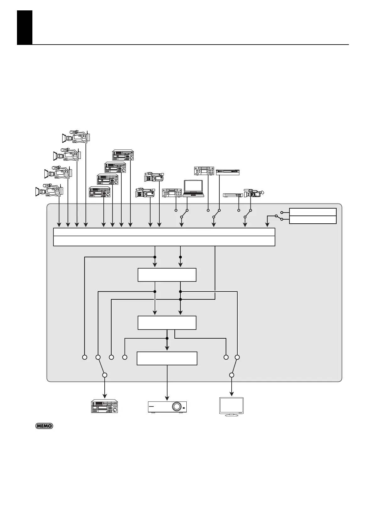 The figure above depicts the state when the V-1600HD’s internal operation mode is set to the DSK mode. Internal signal flow differs when one of