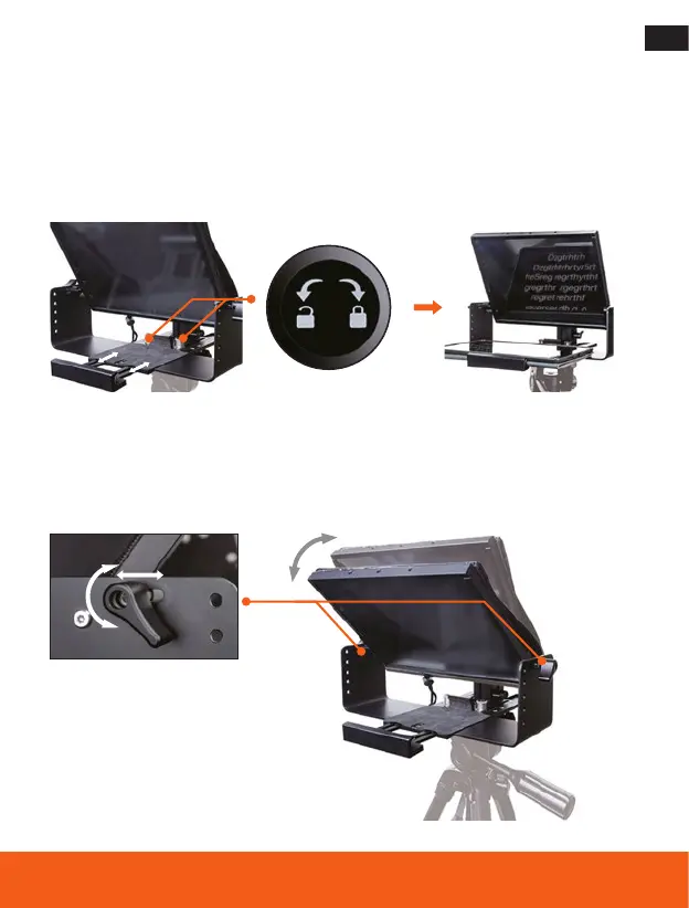 – Loosen the two teleprompter glass locking screws, tilt the telepromp-
