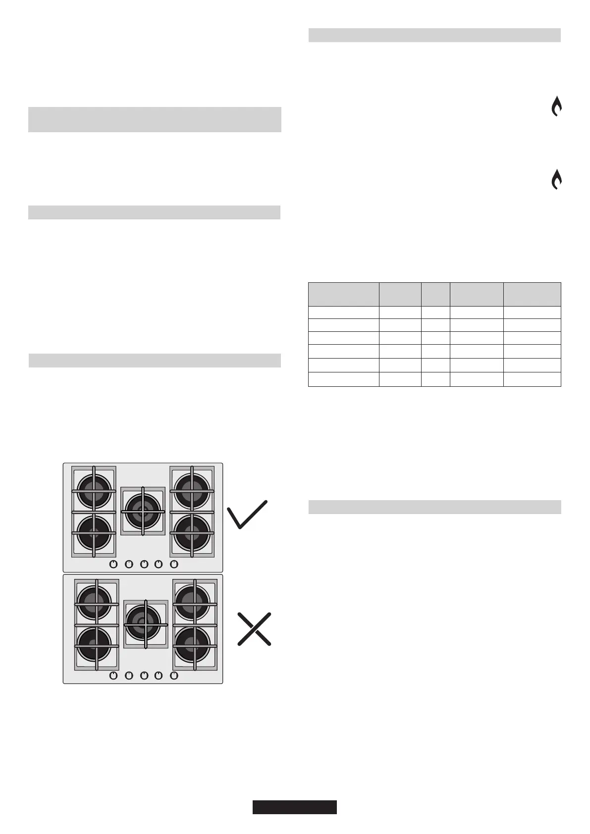 the surface should match the gas burner side as follows. Table A.