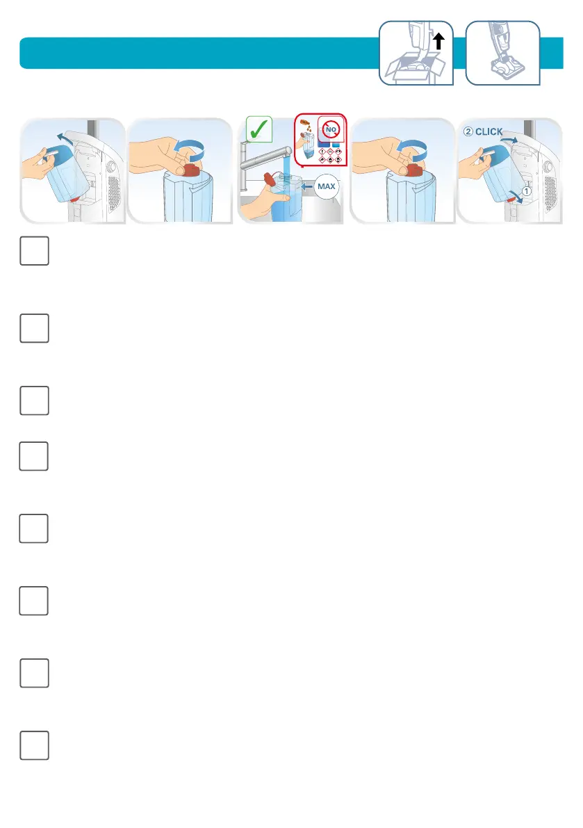 e riempire il serbatoio con acqua di rubinetto. Attenzione! Non aggiungere prodotti
