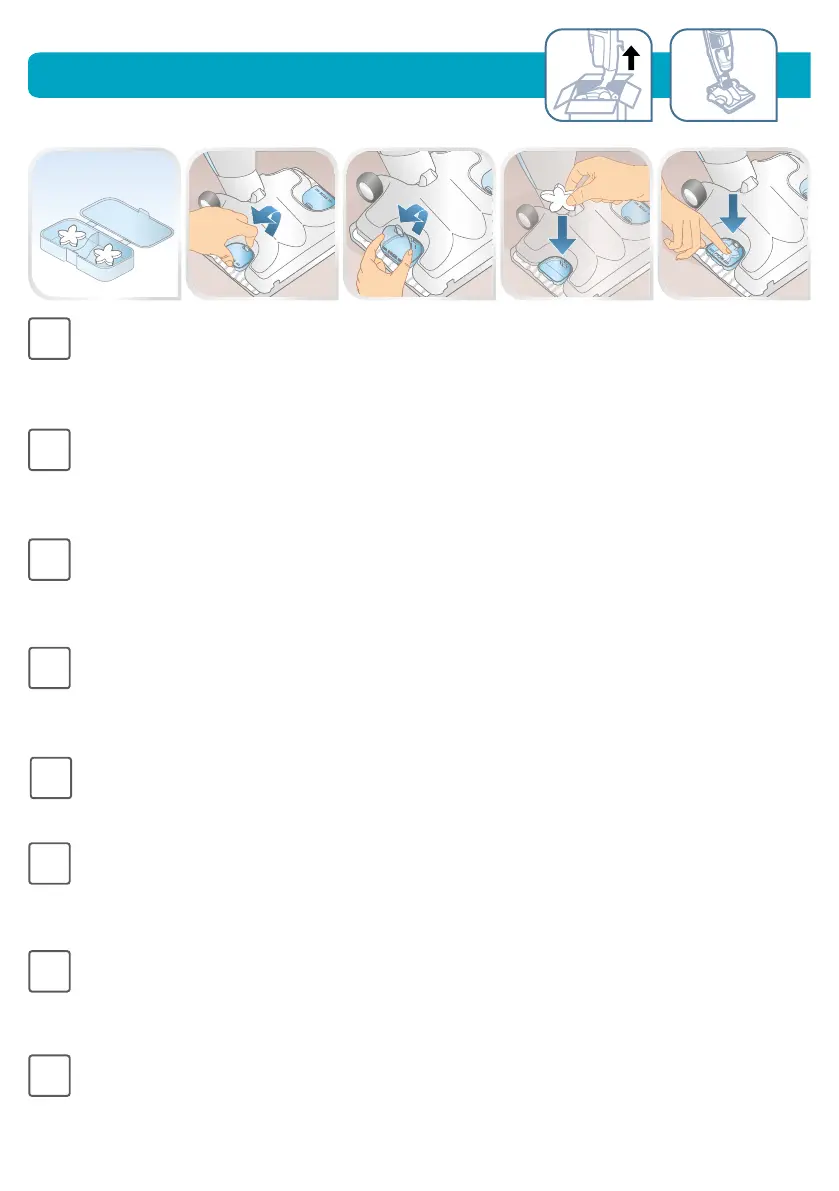 jednu tabletu týdně) přímo na tabletu (tableta nesmí být nikdy ponořená). Poté zavřete víko.