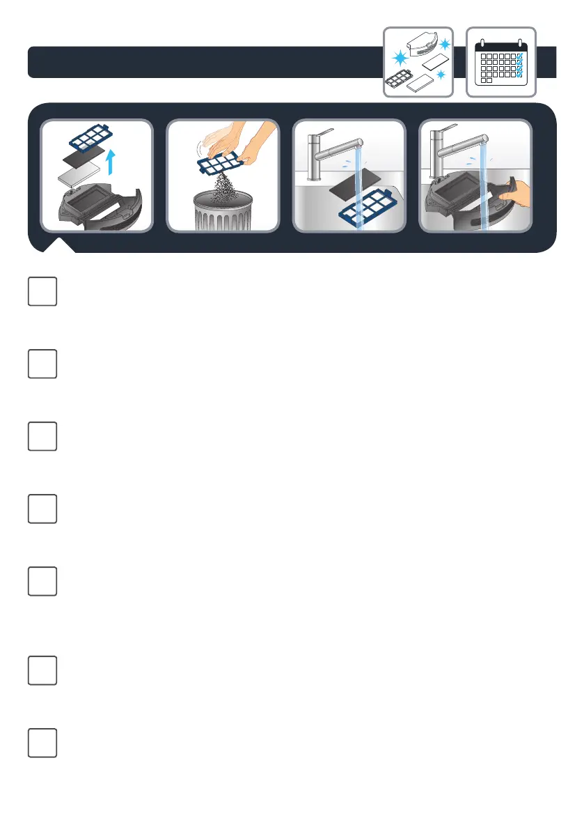 Lavez le ltre en mousse, la grille du ltre et le bac à poussière à l’eau claire. Ne