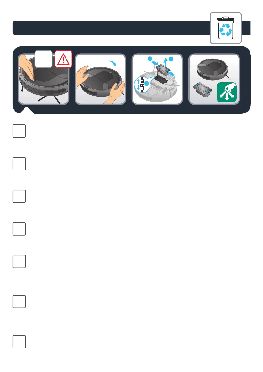 Déconnectez la batterie du robot. Recyclez la batterie et le robot.