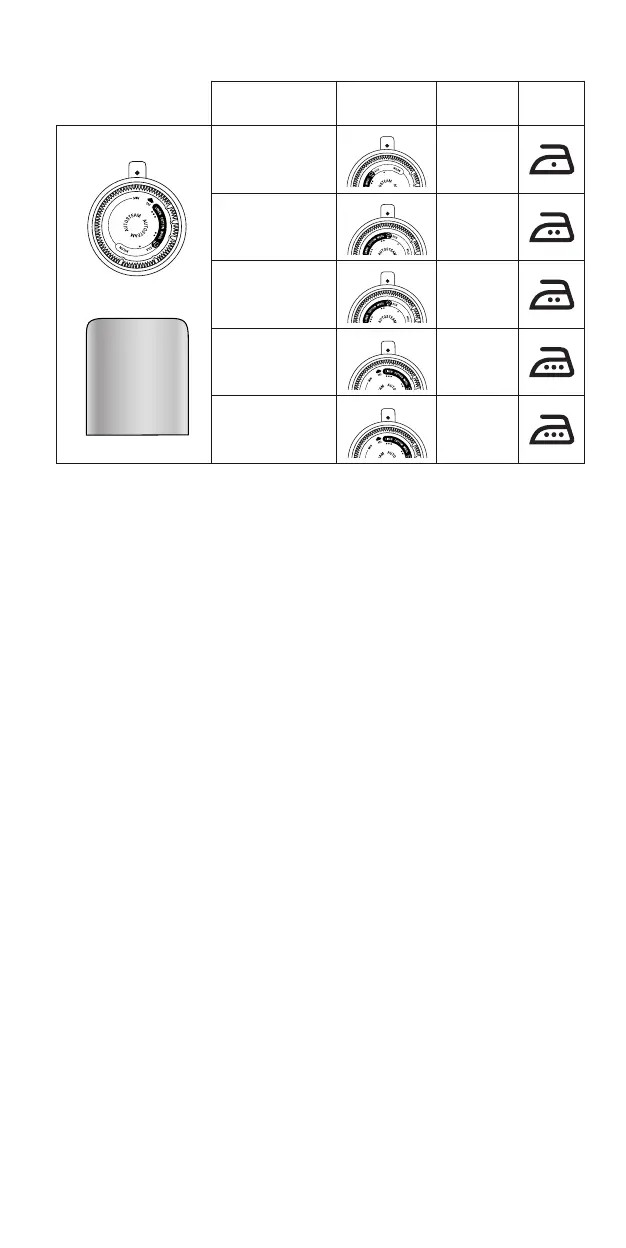 Sørg for at termostatskiven settes på disse merkene. Når strykejernet er tilstrekkelig
