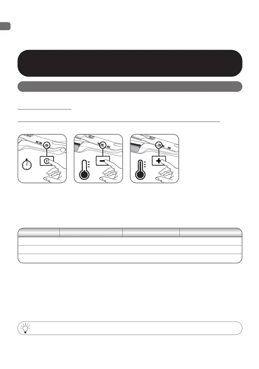 2) Select the ideal temperature for the type of hair you want to straighten using the + and – buttons: