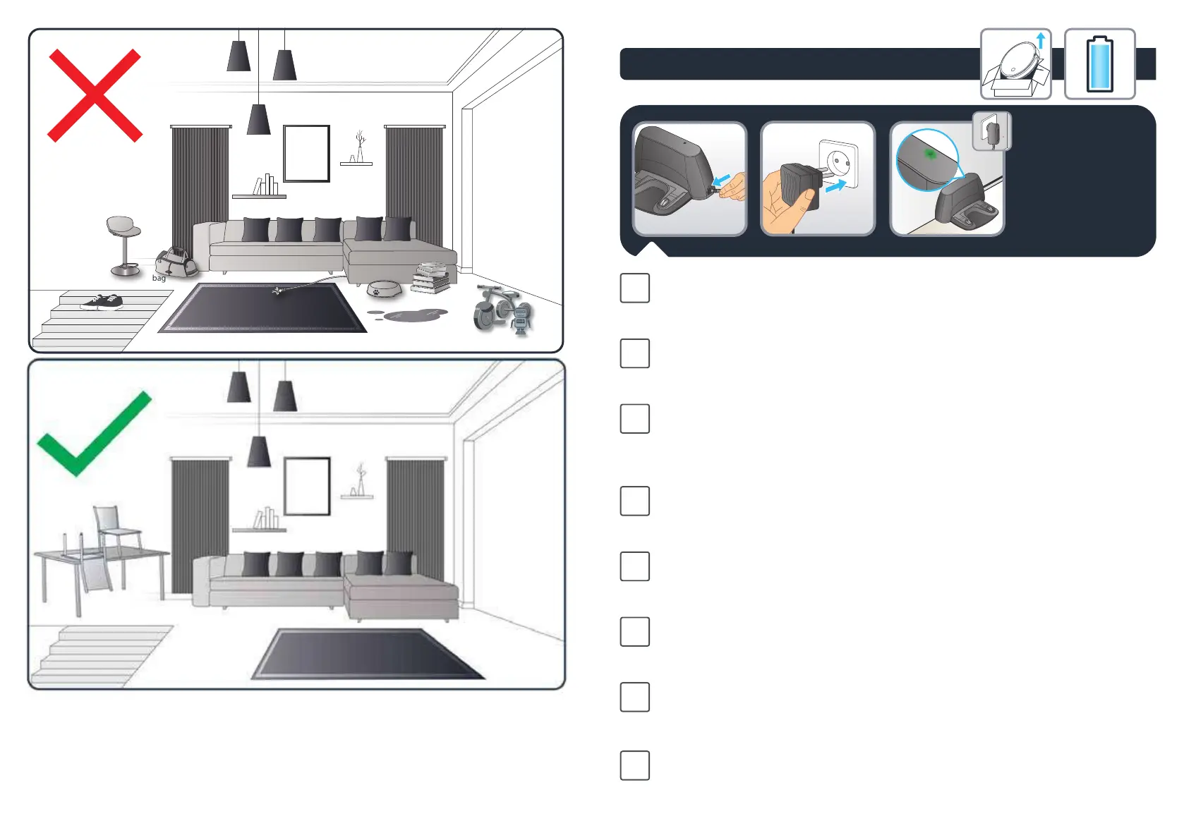 trop épaisses ou de longs poils, s’il est trop léger (ex: tapis de salle de bain) / ES Su robot puede tener problemas con las alfombras: con flecos, demasiado gruesas, de pelo largo, excesivamente ligera (por