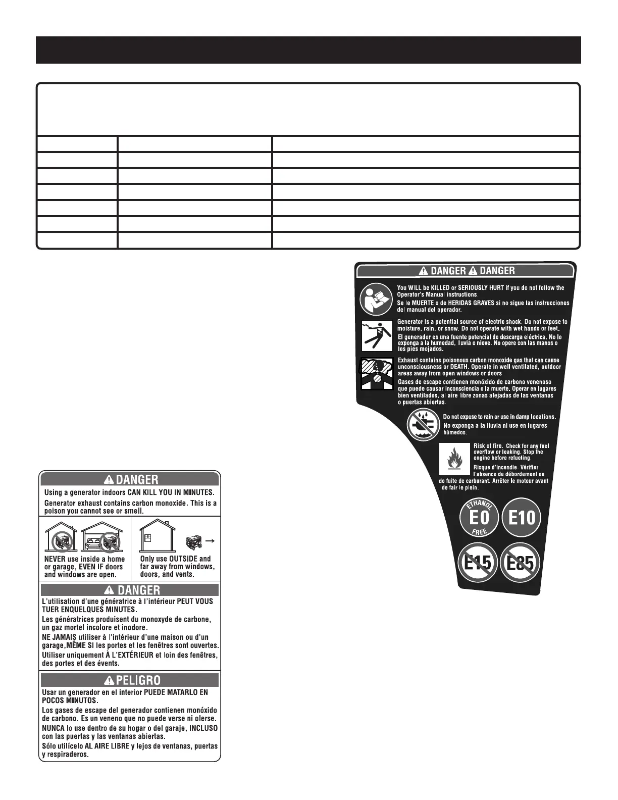 Les informations ci-dessous se trouvent sur le génératrice. Pour des