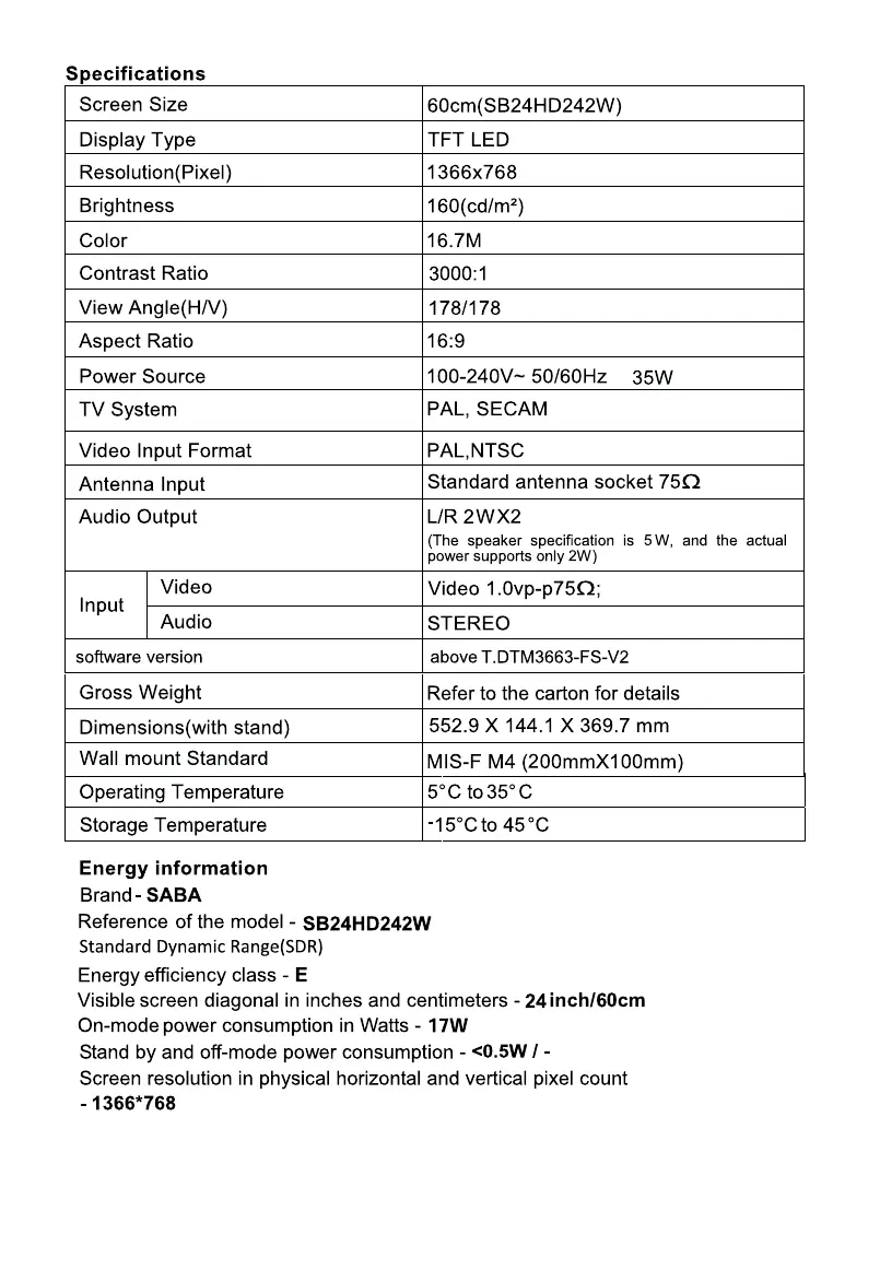 Bekijk gratis de handleiding van Saba SB24HD242W, stel vragen en lees de antwoorden op veelvoorkomende problemen, of gebruik onze assistent om sneller informatie in de handleiding te vinden of uitleg te krijgen over specifieke functies.