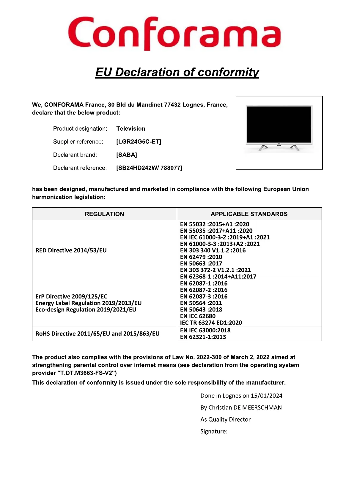 Bekijk gratis de handleiding van Saba SB24HD242W, stel vragen en lees de antwoorden op veelvoorkomende problemen, of gebruik onze assistent om sneller informatie in de handleiding te vinden of uitleg te krijgen over specifieke functies.