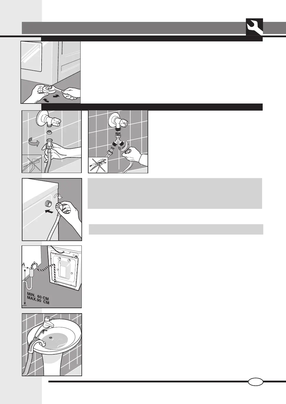 com a máquina. Coloque então o tubo na borda do lavatório e fixe o gancho de