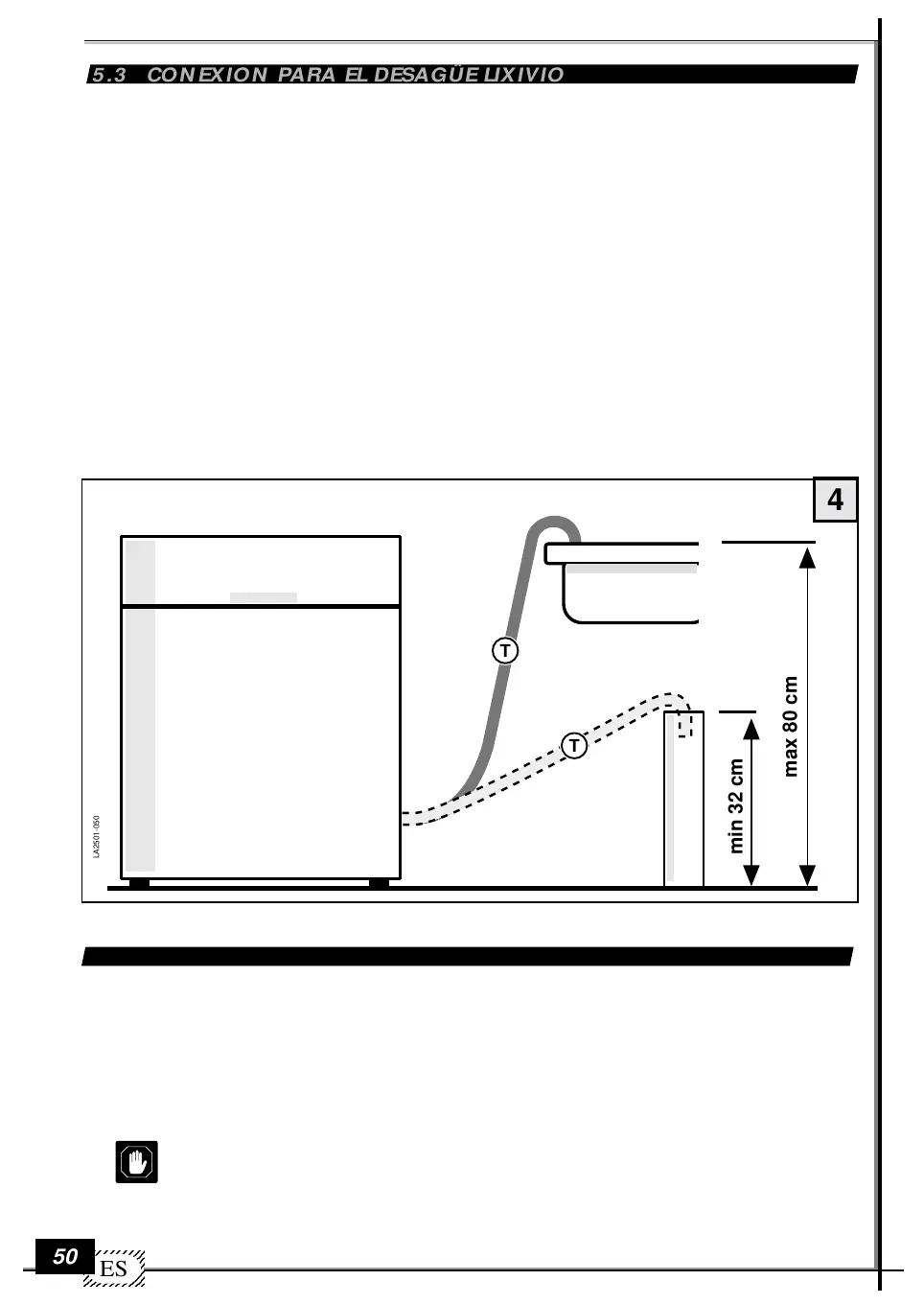 - Hay que colocar la extremidad del tubo en relación con la superficie de apoyo del lavavajillas (fig.