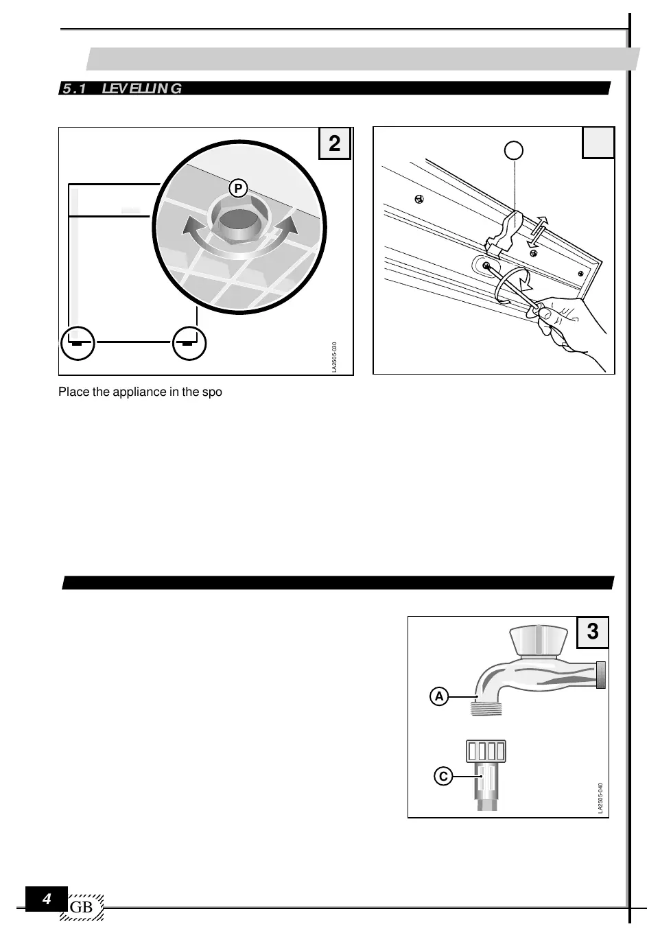Place the appliance in the spot where you want to install it. Use feet P (unscrew or screw in) to regulate