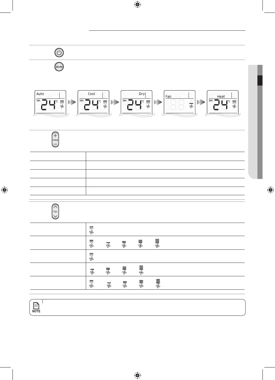 • EachtimeyoupresstheMode button, the mode will change in order of Auto, Cool, Dry, Fan and Heat.