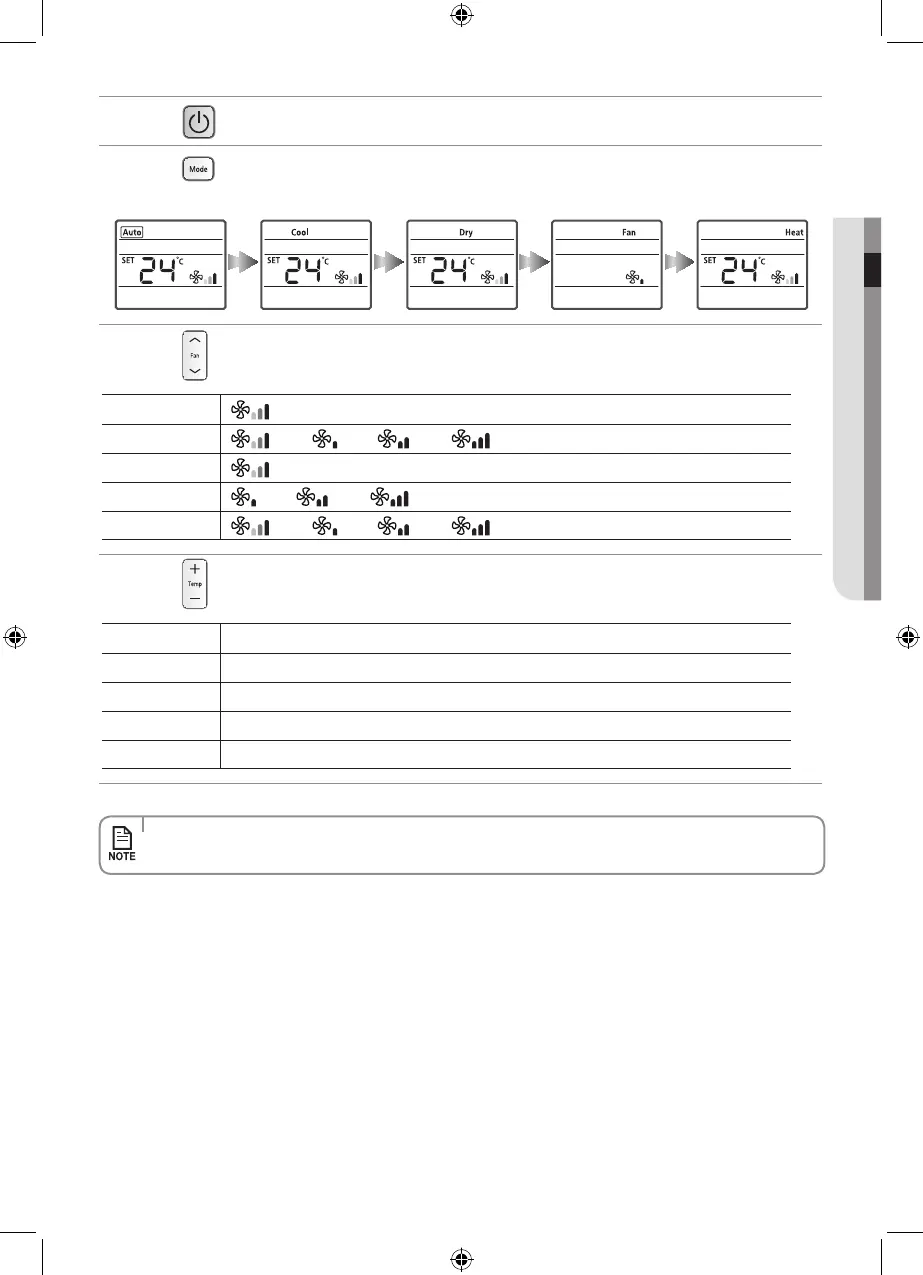 • EachtimeyoupresstheMode button, the mode will change in order of Auto, Cool, Dry, Fan and Heat.