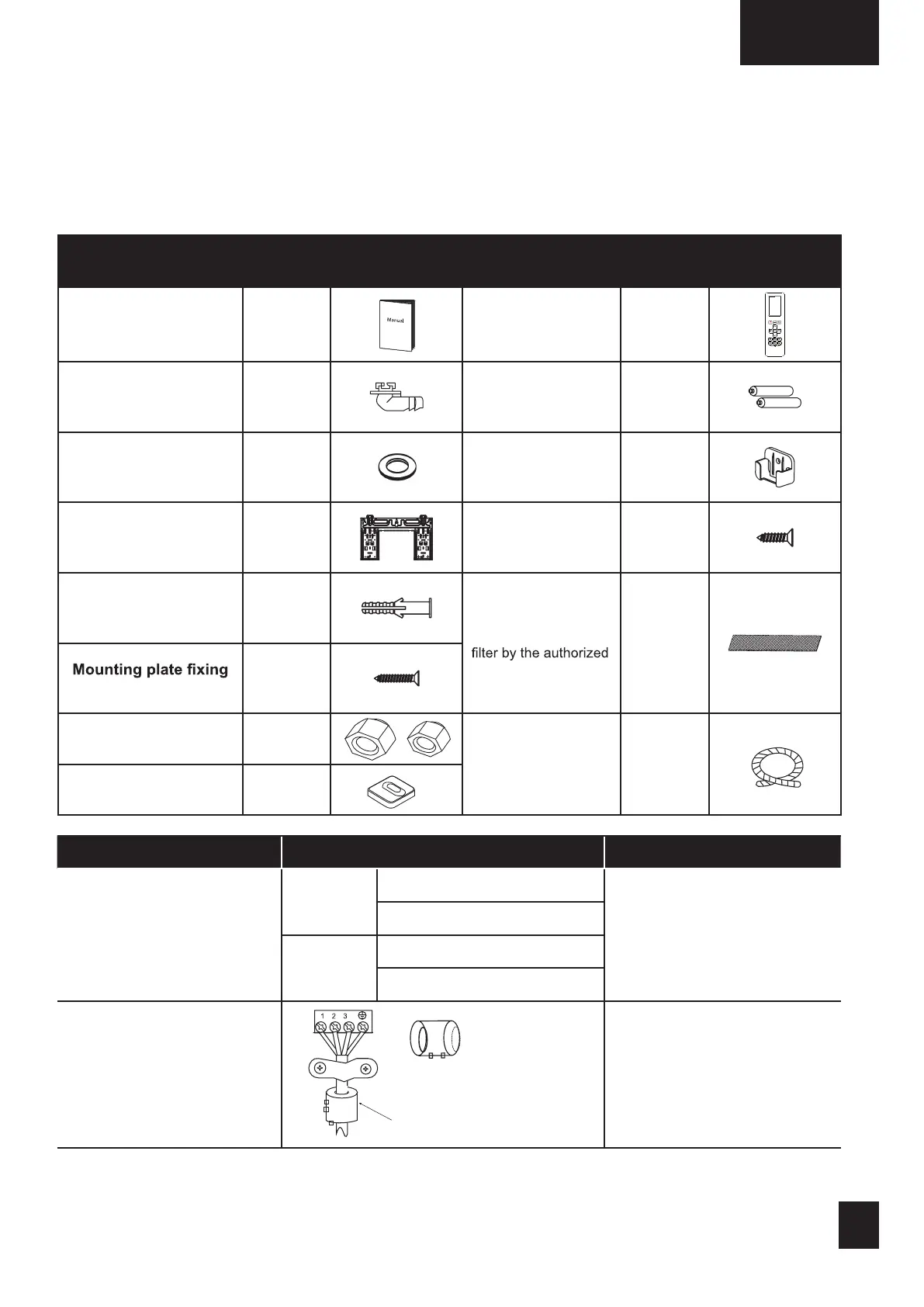 parts and accessories to install the air conditioner. Improper installation may result in water