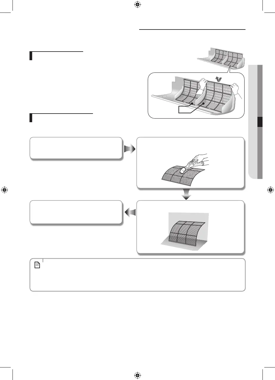 • ทำาความสะอาดแผ่นกรองอากาศทุก 2 สัปดาห์ ระยะเวลาในการทำาความสะอาดอาจแตกต่างกัน ขึ้นอยู่กับการใช้งานและสภาพแวดล้อมในพื้นที่ที่