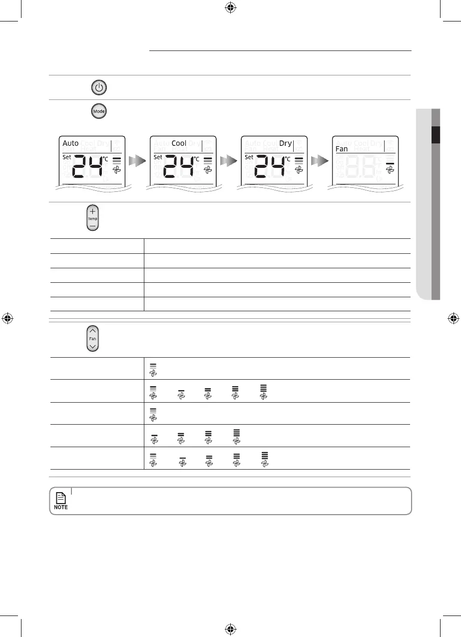 • EachtimeyoupresstheMode button, the mode will change in order of Auto, Cool, Dry, Fan and Heat.