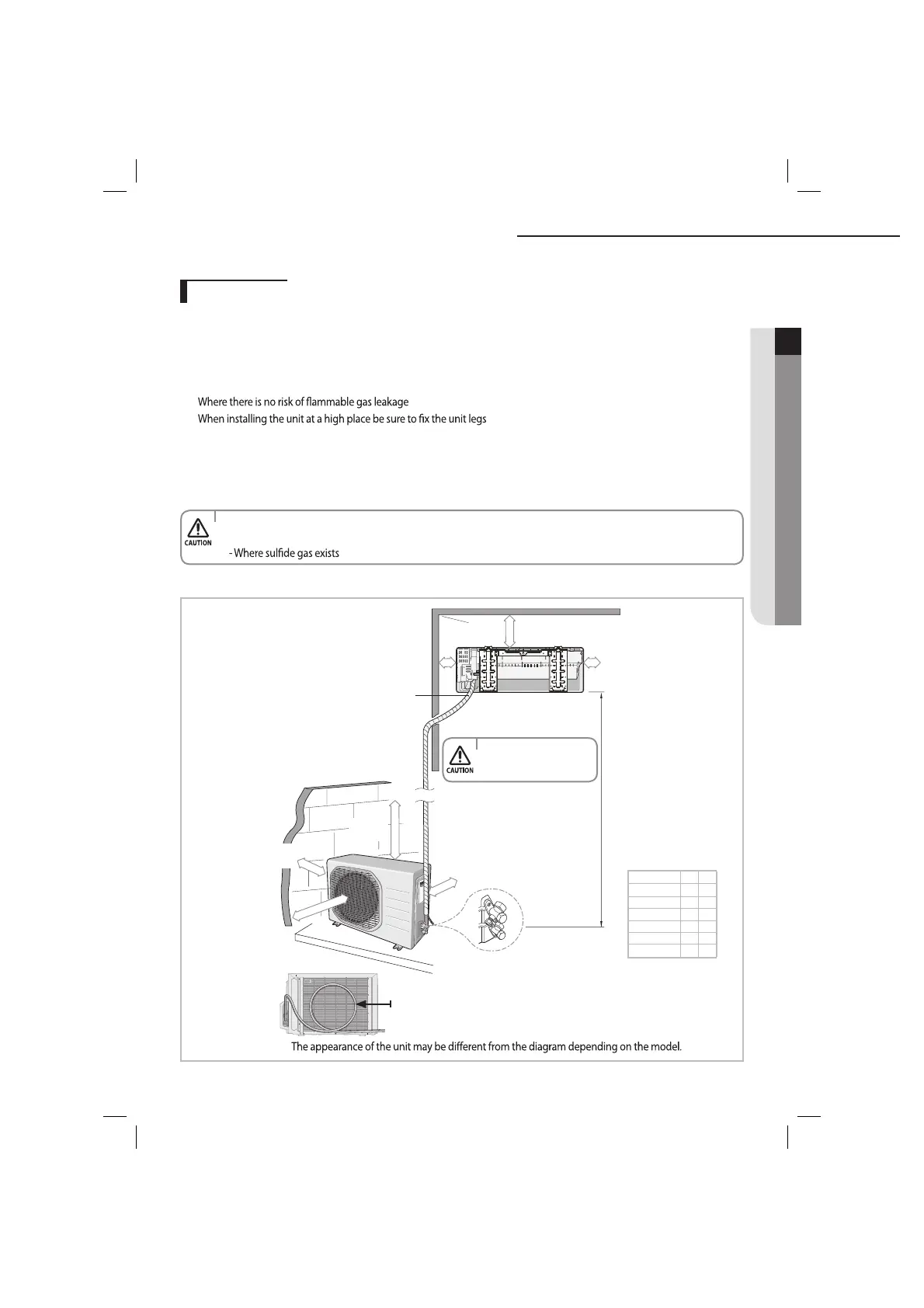 Observe the clearances and maximum lengths as seen in the picture below when installing the air conditioner.