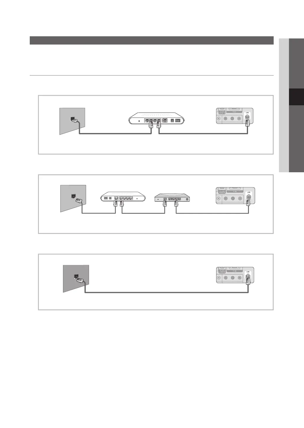 y 您可以將電視後方的 LAN 連接埠連接到已連接至外部數據機的 IP 分享器,連接電視與 LAN。 請使用 Cat 5 纜線進行