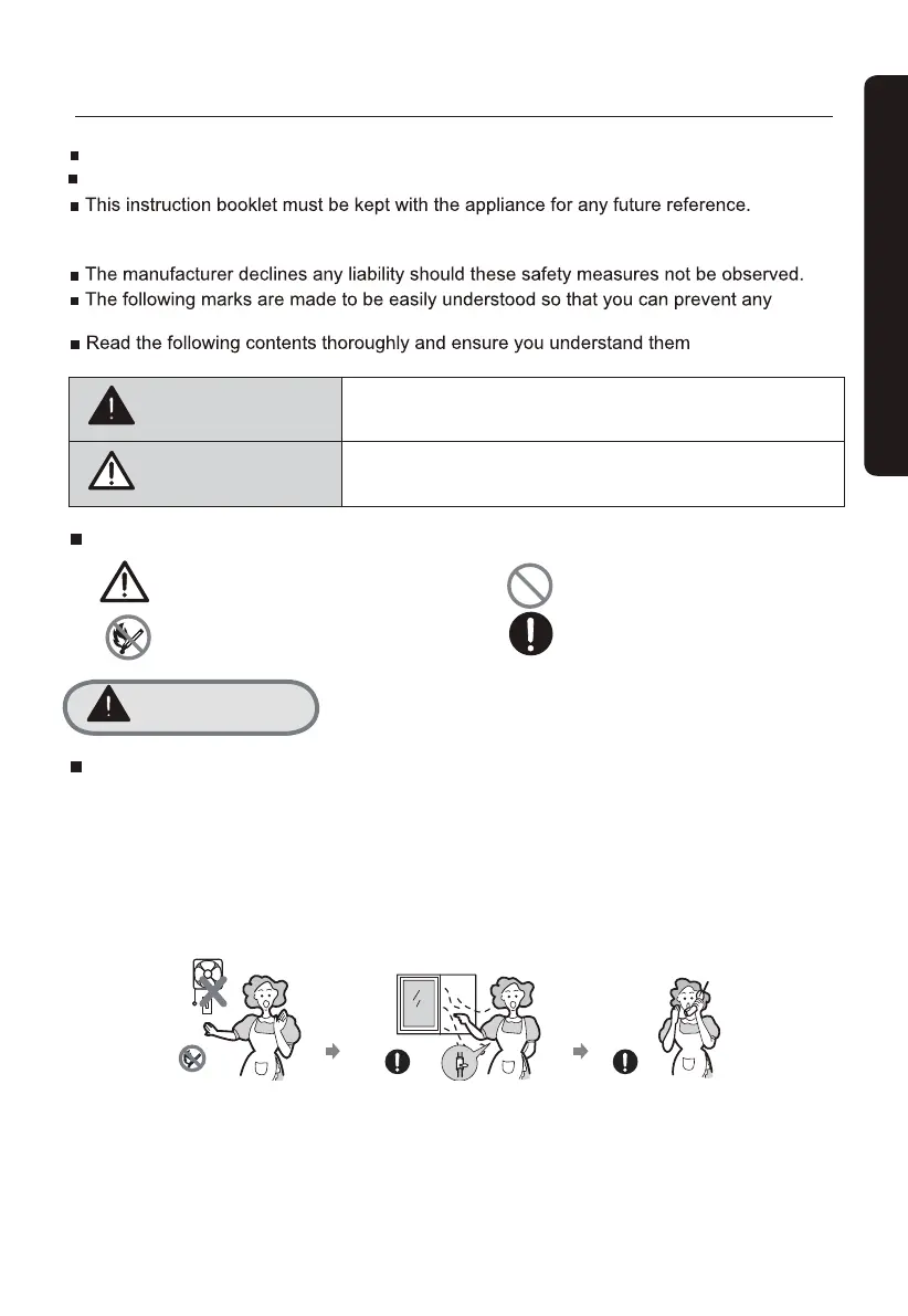 - Do not switch on/off any electrical appliance and do not touch any electric plug.