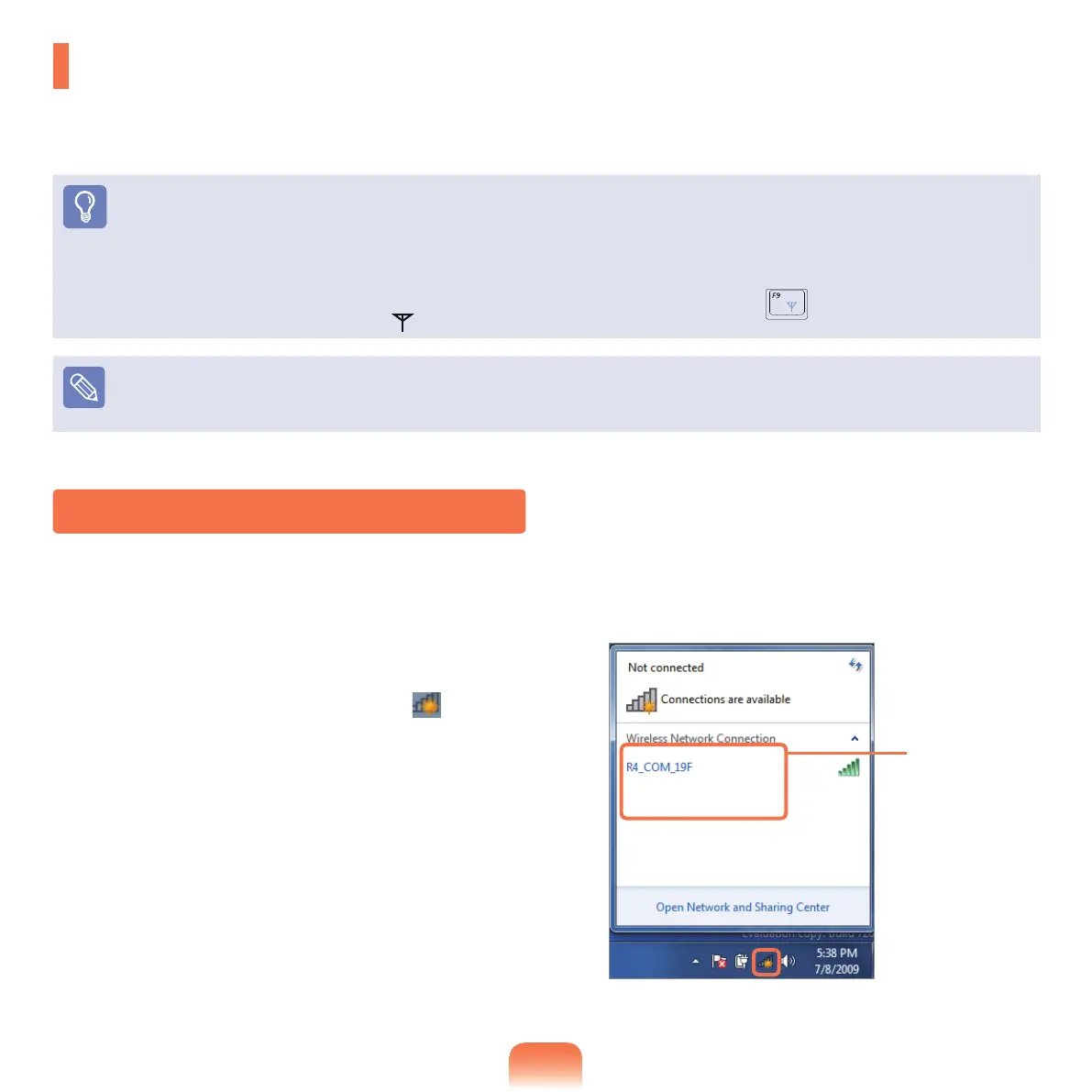 To use the wireless LAN, you have to turn the wireless LAN on rst by pressing the Fn + keys. If the wireless LAN is
