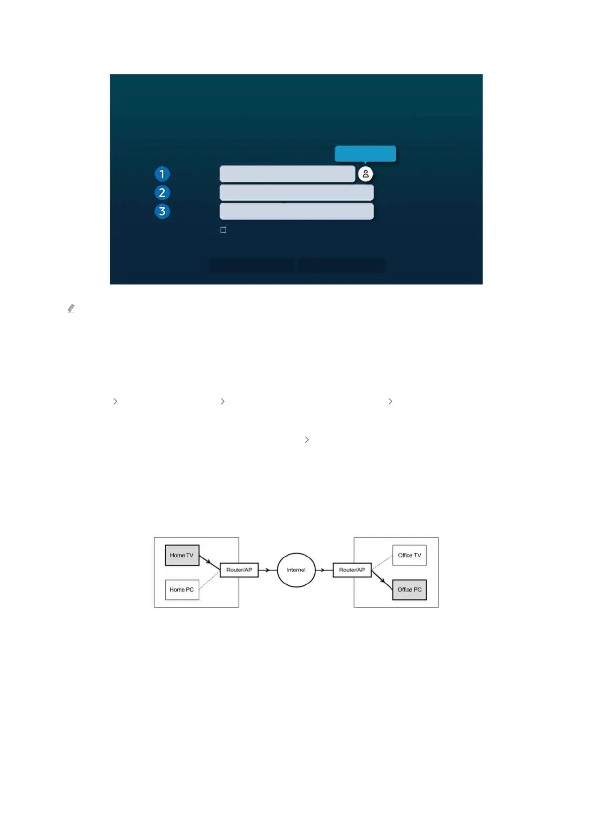 • When the TV and computer are not within the same network, it is required to know the public IP and configure