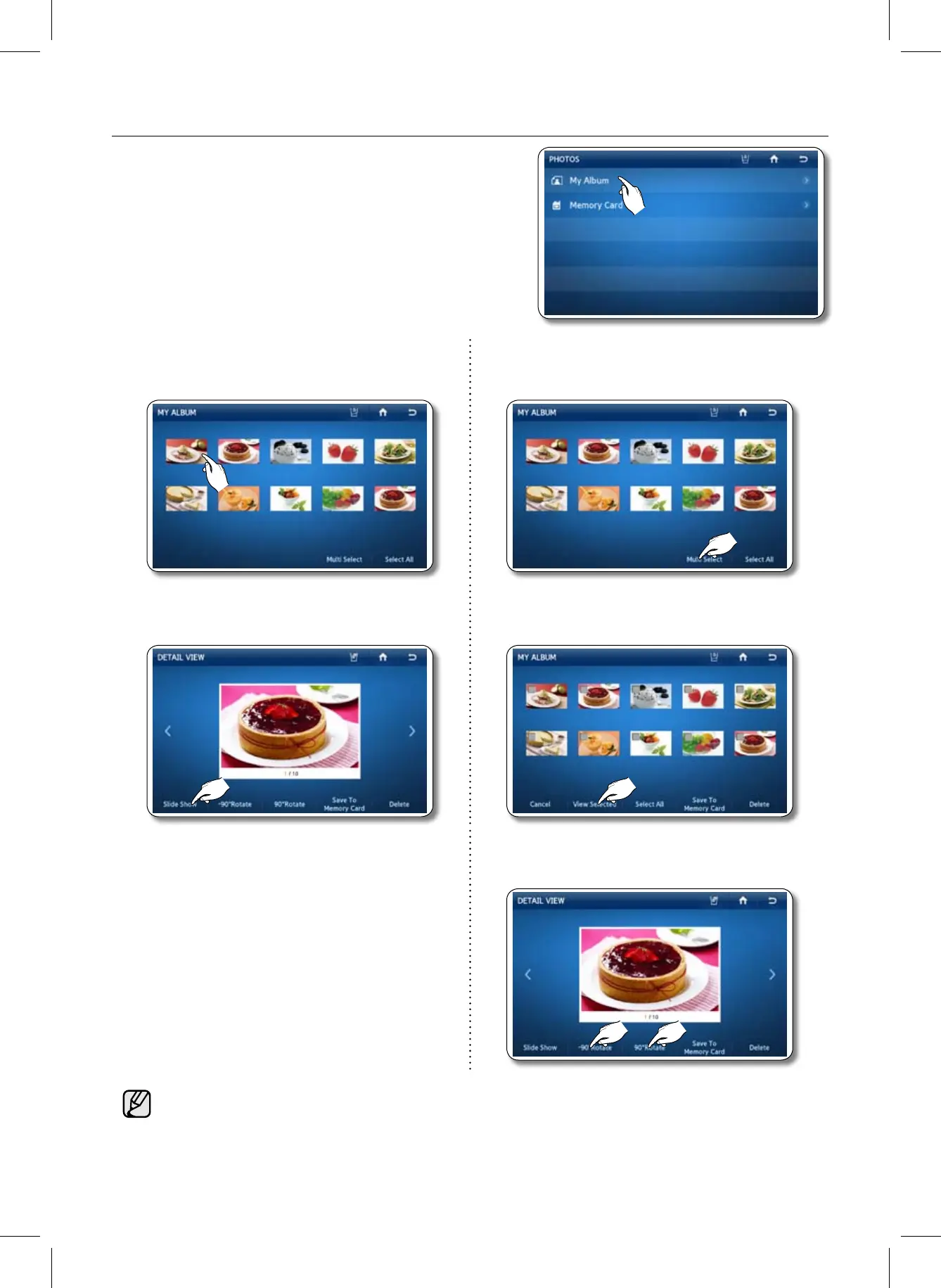 2. Touch the photo you want to rotate. 2. Press the Multi Select button to rotate multiple