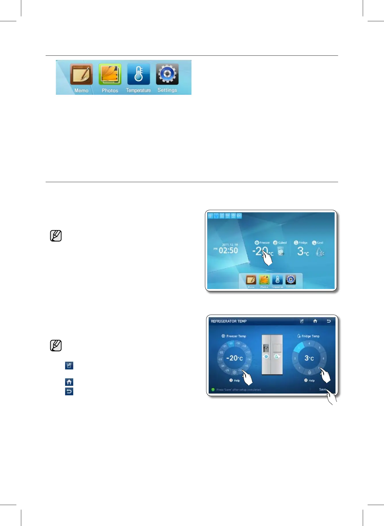 Settings : Lets you set the refrigerator’s basic functions such as Door Alarm, Time, etc.4.