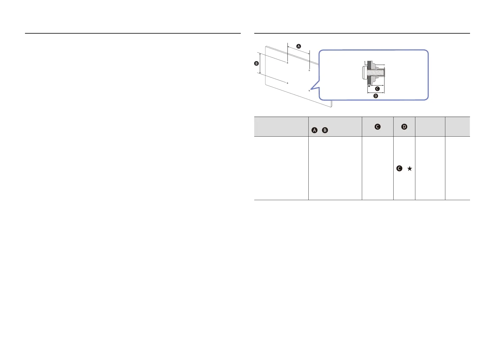 • For wall mounts that do not comply with the VESA standard screw specifications, the length of the