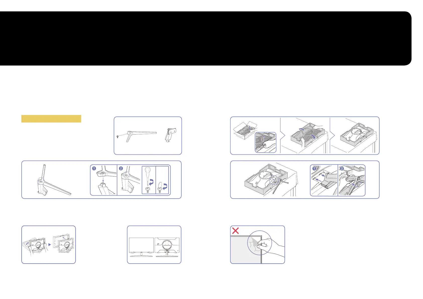 Stand up the monitor and remove the package. Stand assembly is complete. Caution