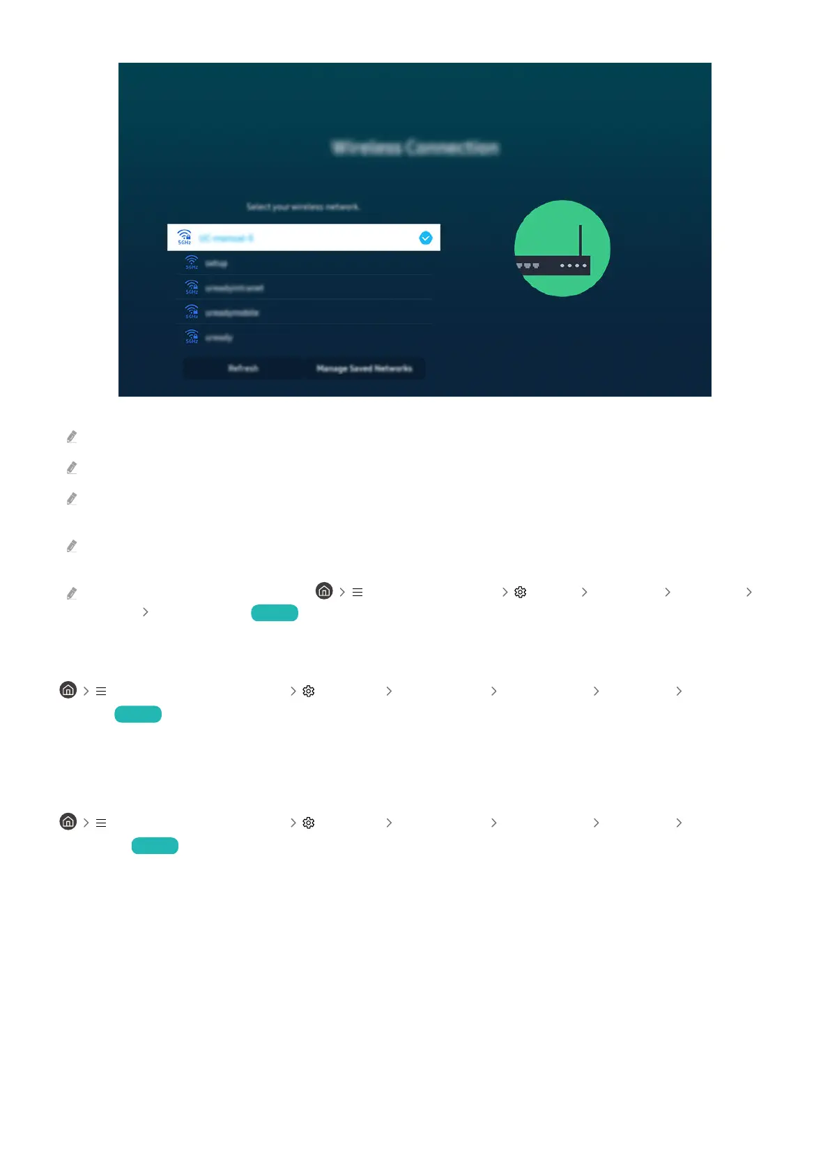 To view or delete previously connected network names (SSIDs), move the focus to Manage Saved Networks, and then press