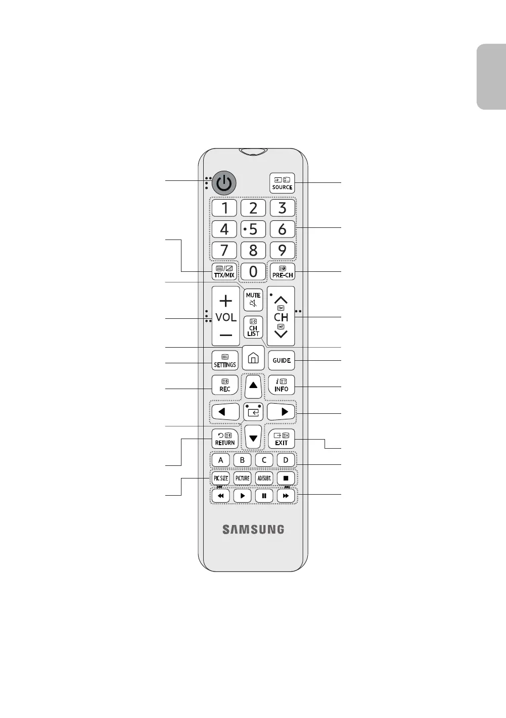 Learn where the function buttons are on your remote, such as: SOURCE, TTX/MIX, PRE-CH, < CH >, CH LIST,