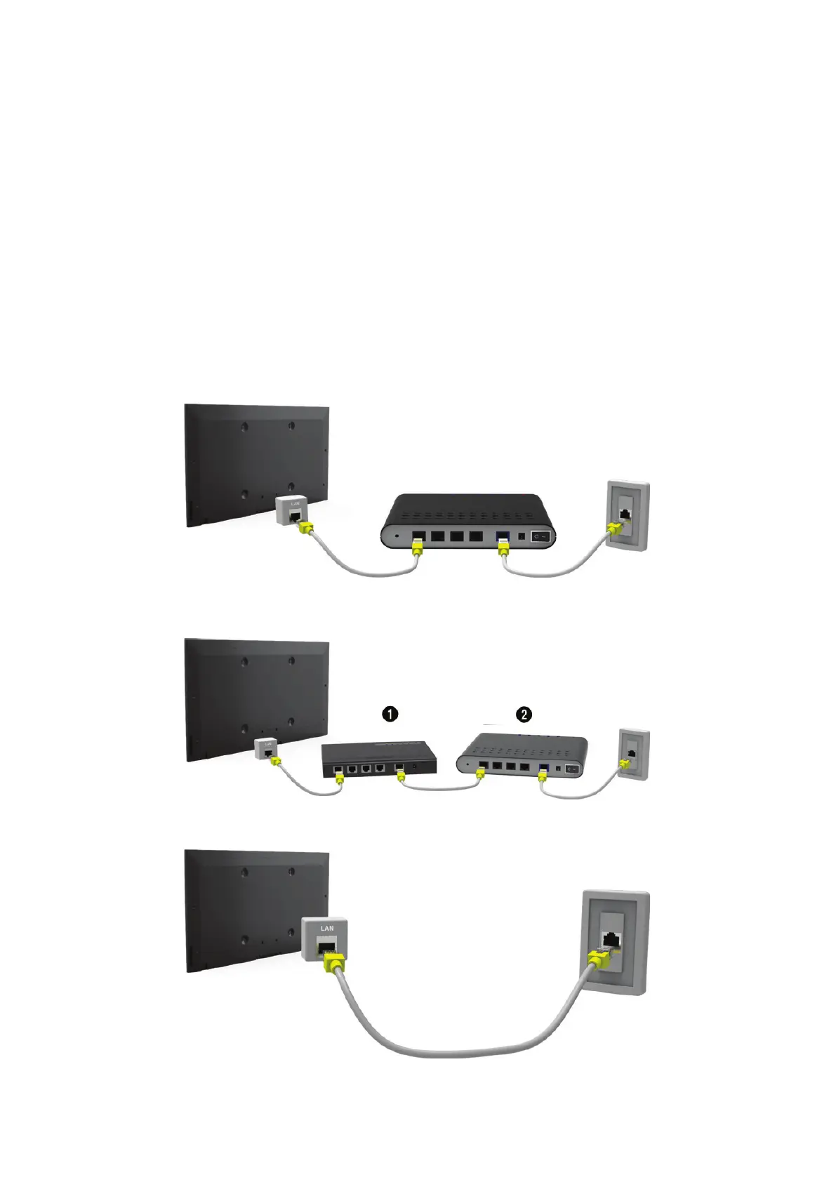 There are three ways to connect the TV to the Internet. Refer to the diagrams and connect the LAN