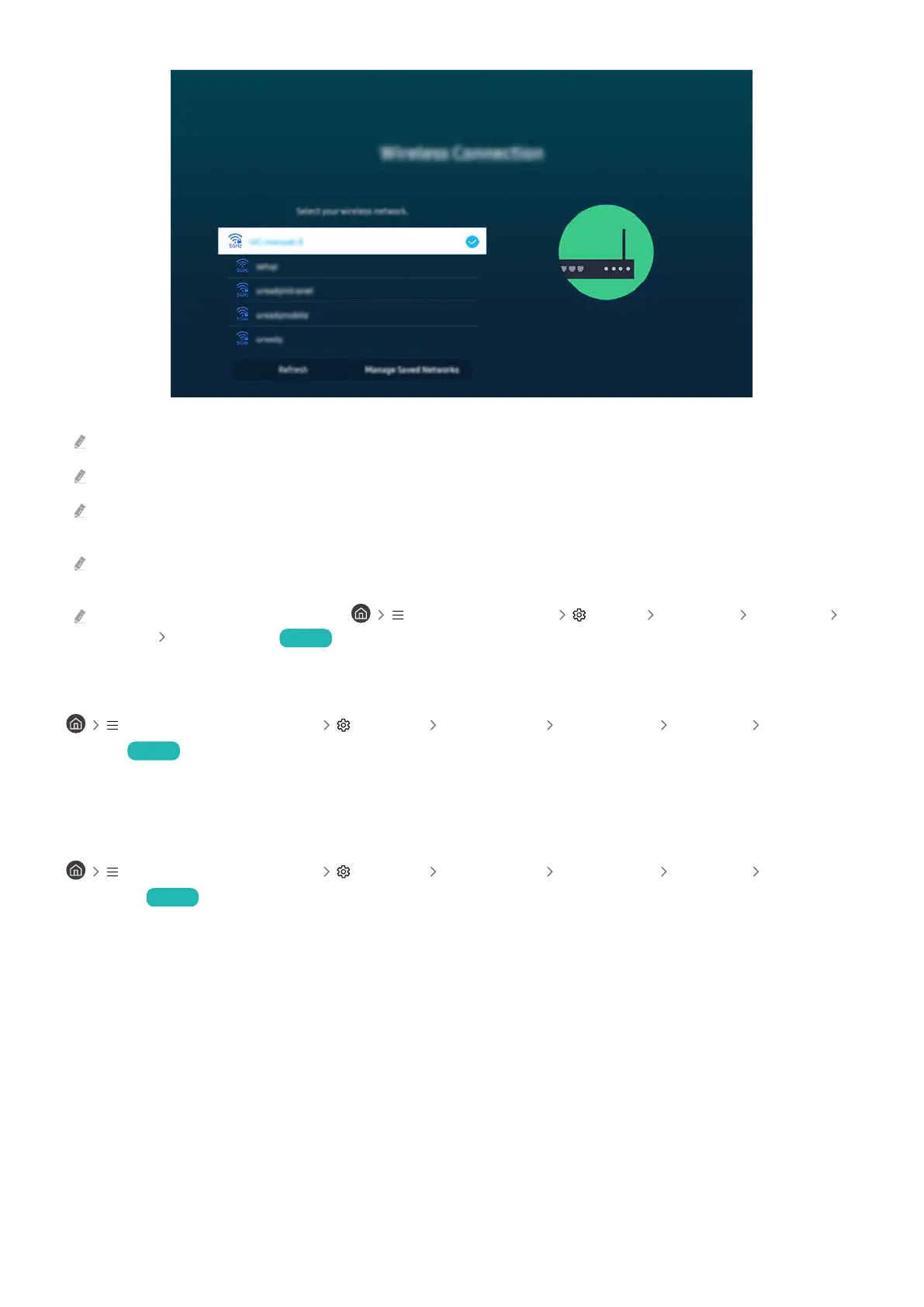 To view or delete previously connected network names (SSIDs), move the focus to Manage Saved Networks, and then press