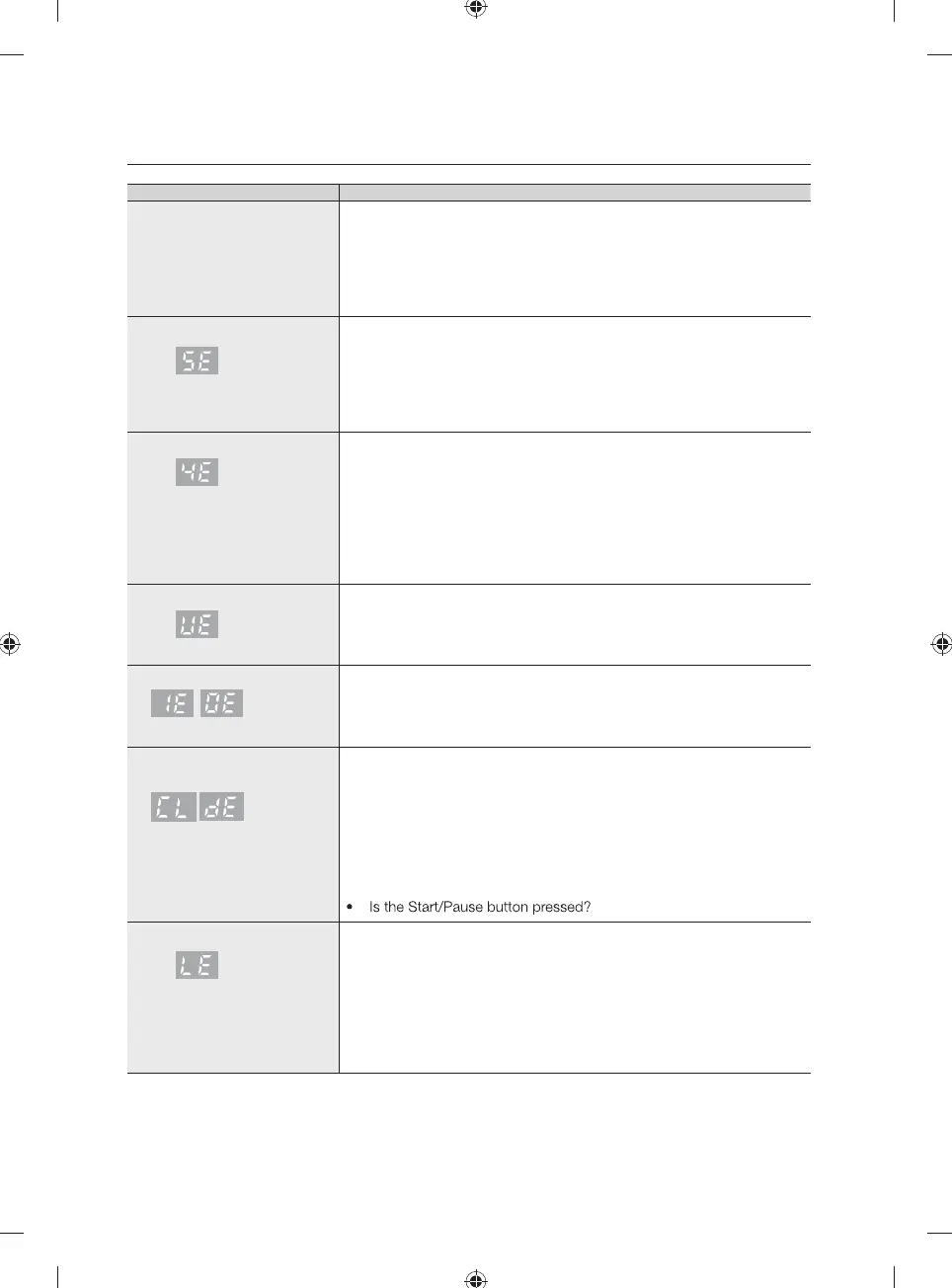 Water leakage error • Check if the end of the drain hose is placed on the fl oor. (The hose