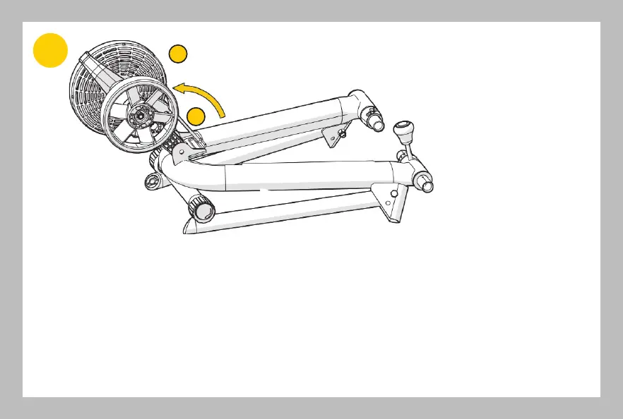 Placez l’unité de résistance (b) entre les crochets sur le châssis et guidez le boulon en L (f) vers le centre de l’unité de résistance (b).