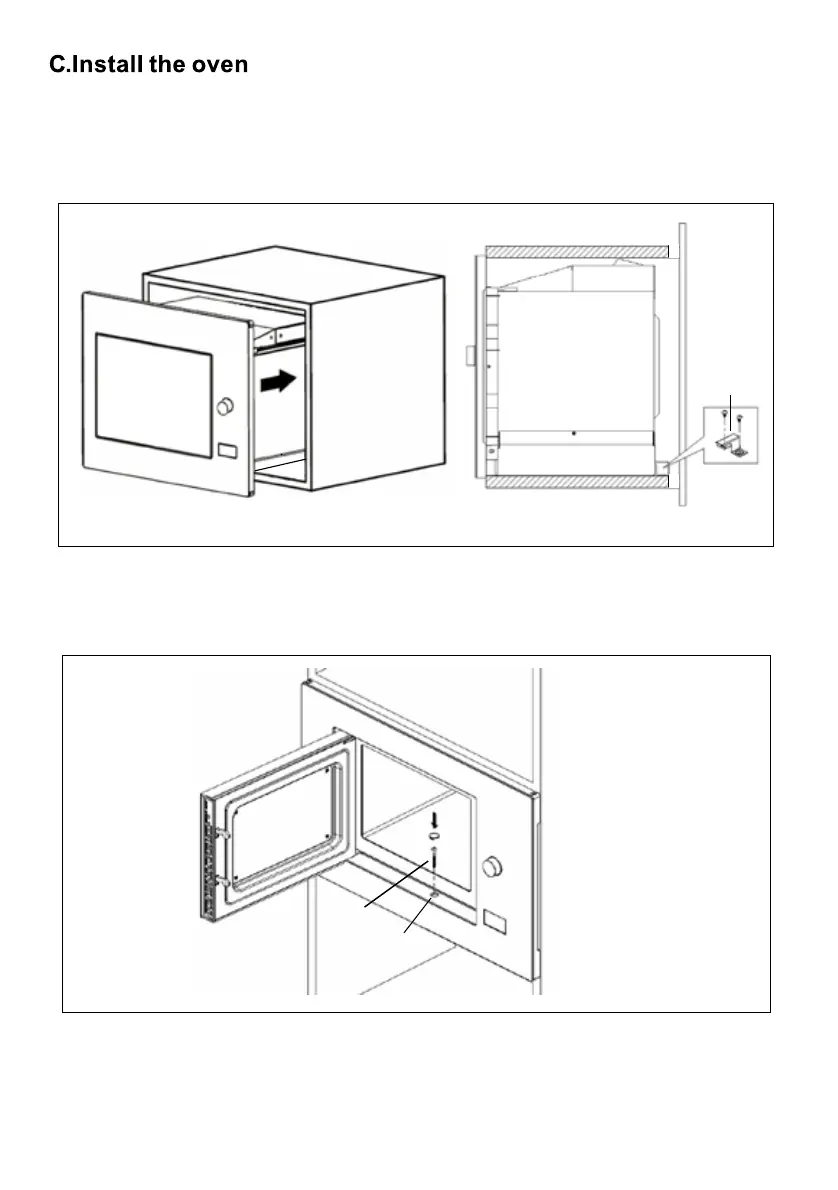 5. Open the door, fix the oven to the cabinet with Screw B, at the installa tion hole.