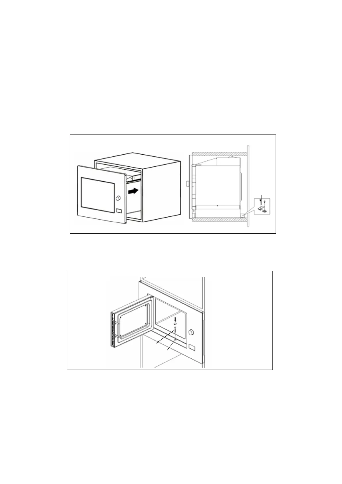 5. Abra a porta, fixe o microondas ao móvel com os parafusos B, no orifício de