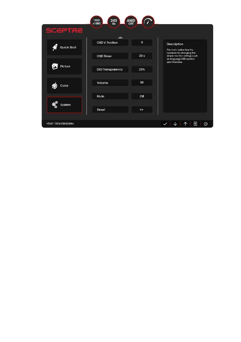 12. RESET – This option resets the monitor to Sceptre's factory default settings.