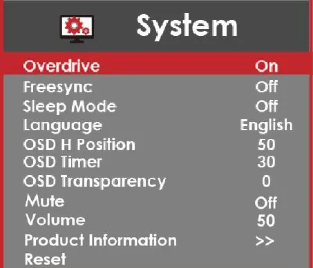 1. OVERDRIVE – This option increases the pixel response time of the LCD screen.