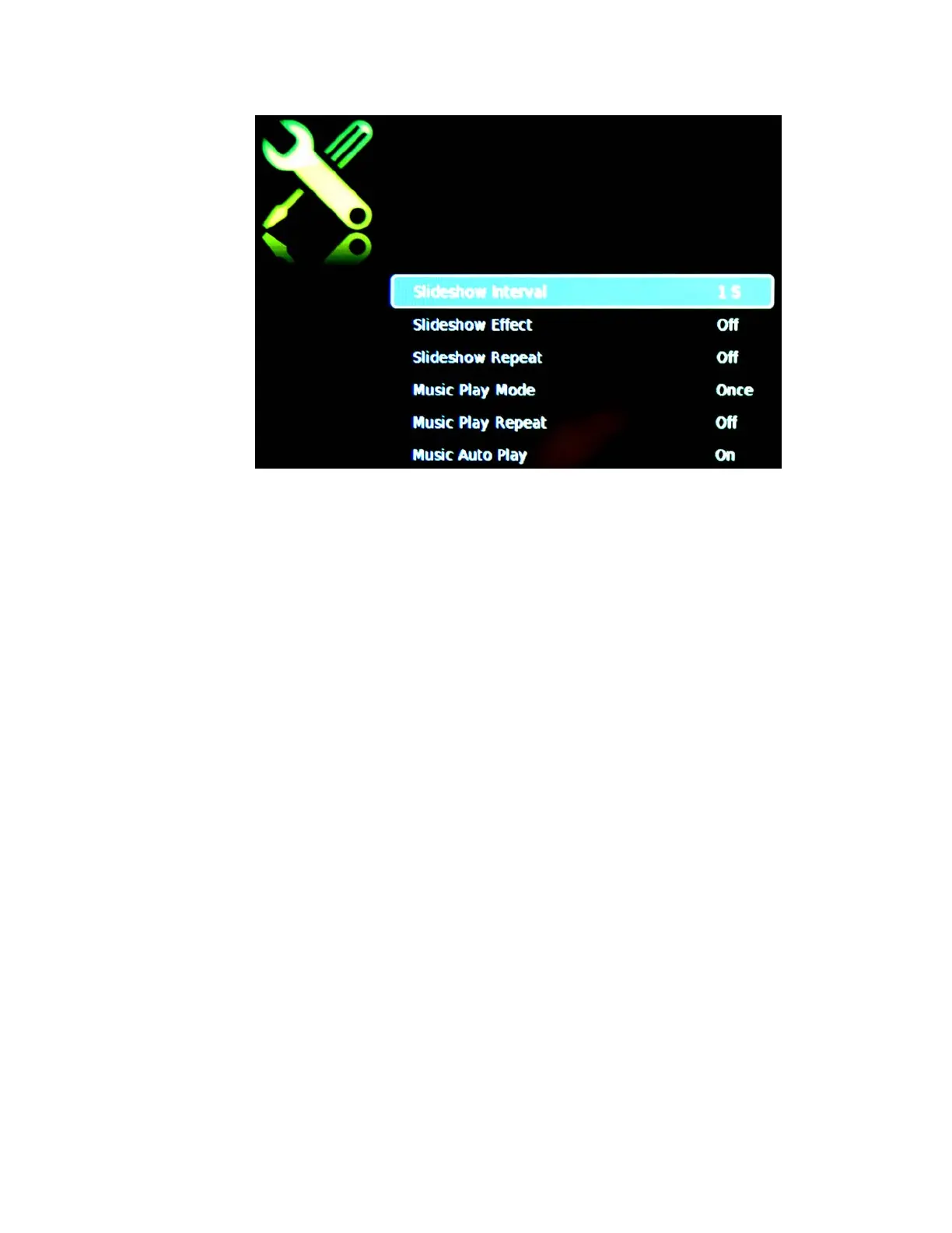 1. SLIDESHOW INTERVAL – This option adjusts the time interval of a displayed picture.