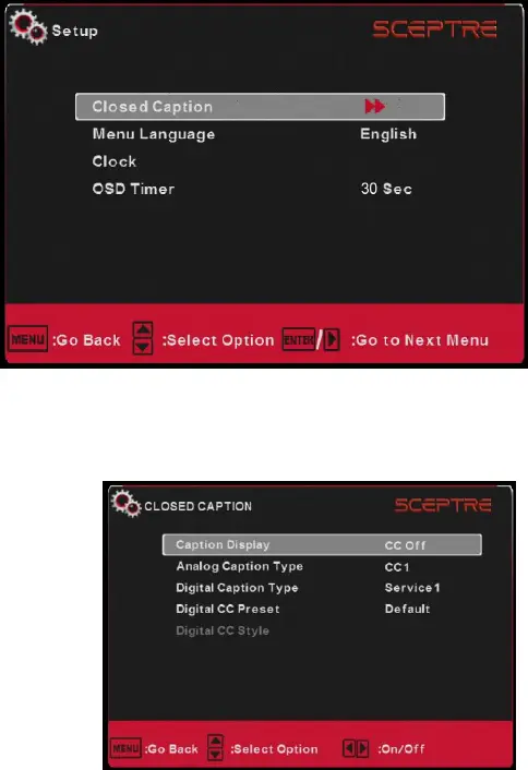 i. CAPTION DISPLAY – This turns on or off the closed captioning.
