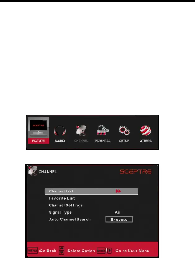 4. Use the ▲ or ▼ buttons to select AUTO CHANNEL SEARCH and press ENTER to scan