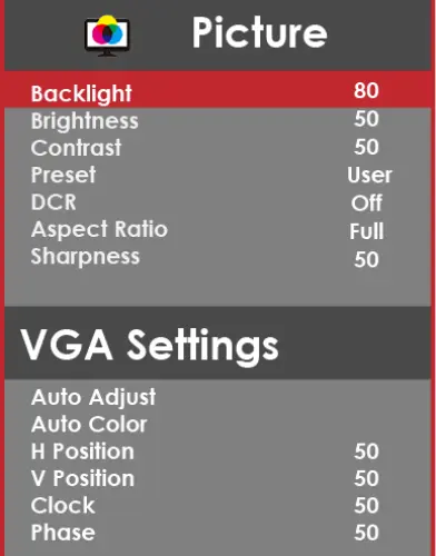 6. ASPECT RATIO – This option lets the user adjust the aspect ratio of the monitor.