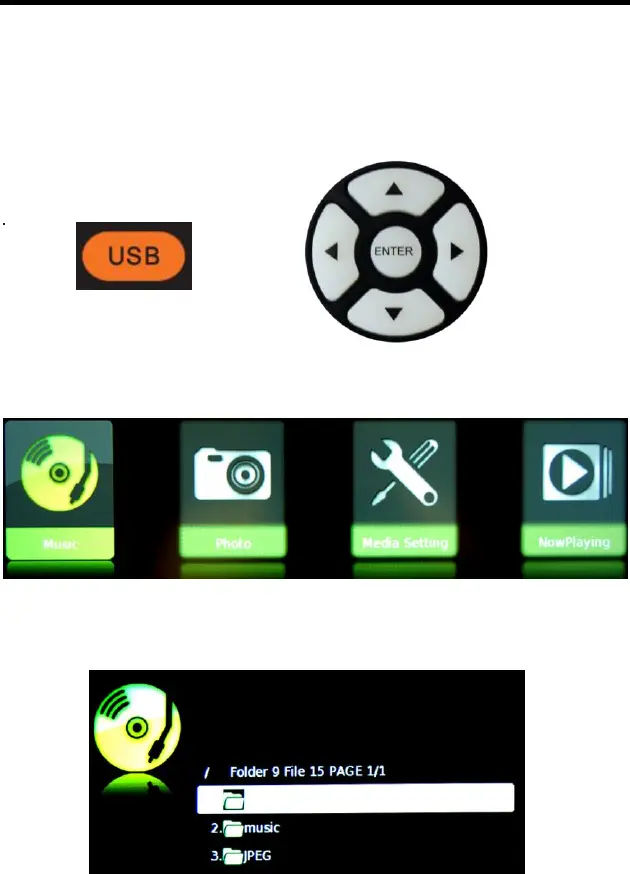 Once you press the USB button the USB menu will come up. Select either the music or picture you